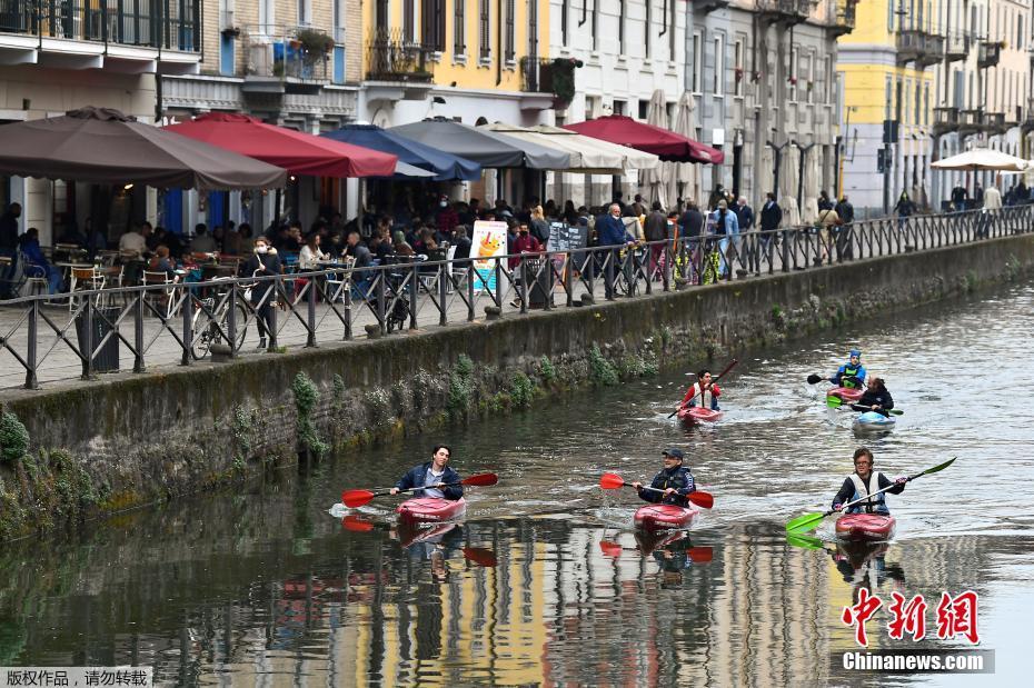 当地时间4月26日,根据意大利总理德拉吉的内阁公布的防疫政策,当日起,意大利大部分地区开始放松新冠疫情管控措施,将恢复疫情黄色监控区,开放户外餐厅、电影院、剧院、游泳池和健身房等公共设施。图为民众在米兰的运河里划船。