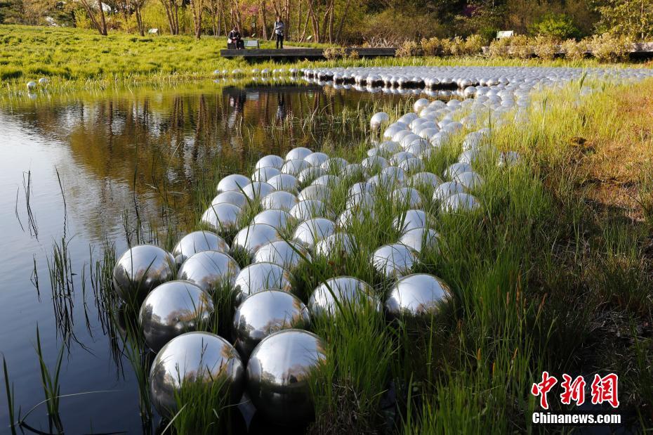 当地时间4月27日,国际知名艺术家草间弥生“宇宙自然”艺术展正在纽约植物园举行,该展因新冠疫情推迟一年举行,展期将从4月持续到10月。图为民众欣赏展览作品“水仙花园”。