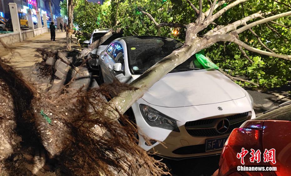 5月1日,江苏省南通市委宣传部对外通报,受东北冷涡影响,4月30日傍晚起,江苏省南通市出现雷暴大风、冰雹等强对流天气,最大风力达14级。截至目前,极端灾害天气已造成11人死亡、102人因灾受伤,受灾人口3000余人。图为4月30日晚,南通市区内的行道树被连根拔起,倒在路边停放的车辆上。