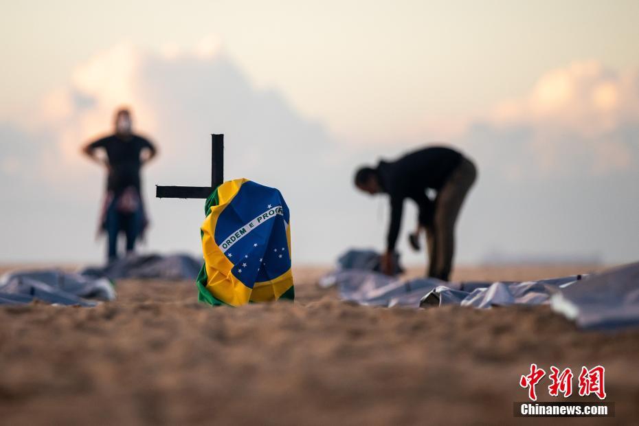 近日,巴西里约热内卢,巴西民众在里约著名的科帕卡帕纳海滩纪念该国40万因新冠肺炎而逝去的生命。