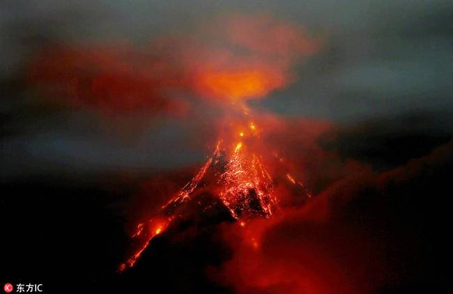 当地时间2018年1月27日,位于菲律宾阿尔拜省的马荣火山持续喷发,熔岩喷射高达3千米。