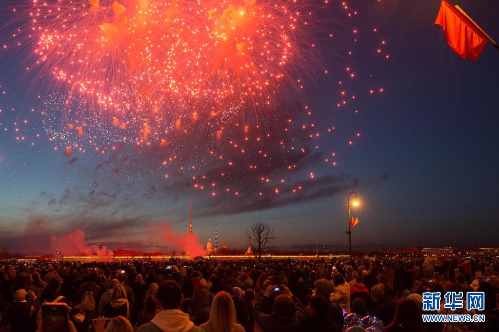当日,俄罗斯圣彼得堡燃放烟花,纪念卫国战争胜利76周年。