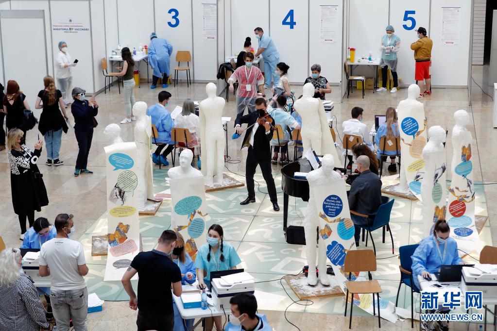 从5月7日下午开始,布加勒斯特举行连续3天不间断的“接种马拉松”活动,民众无需预约就可前往接种新冠疫苗。活动期间,当地艺术家现场演奏音乐,为参加此次活动的医务工作人员和接种者助兴。