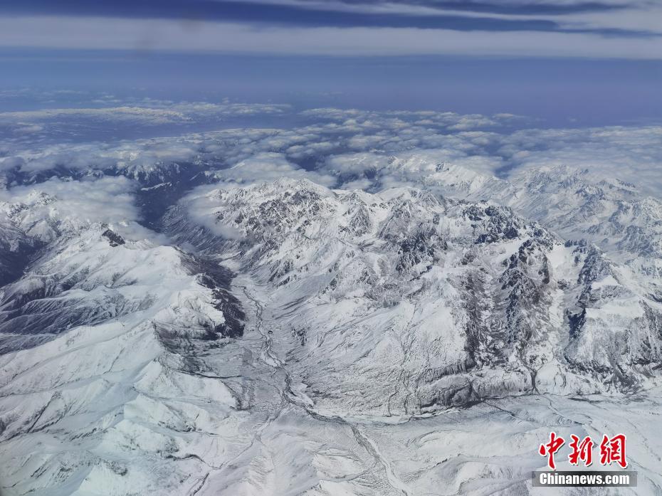 5月23日,航班上拍摄的甘肃省张掖市至青海省门源段祁连山初夏白雪皑皑壮美景色。祁连山脉位于甘肃、青海两省交界处,平均海拔3500米以上,山峰白雪皑皑,从空中俯瞰,沟壑纵横、山峦起伏,雄浑壮美、巍峨壮观。