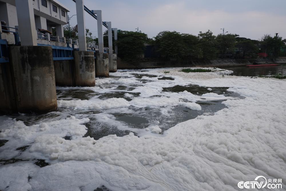 当地时间2021年6月7日,印度尼西亚雅加达,水源遭到污染,当地河流上漂浮着白色的泡沫。