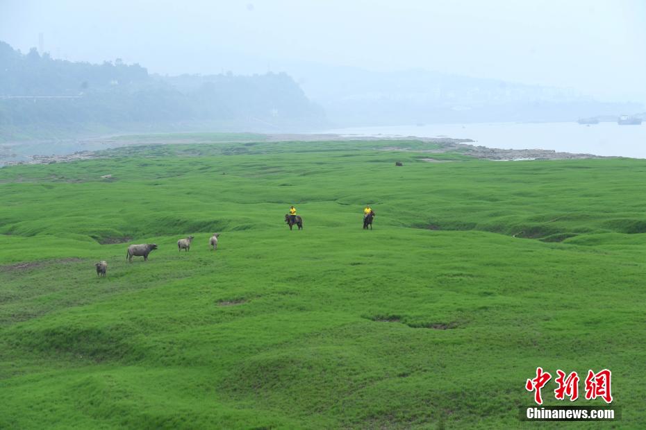长江裸露河床成美丽绿色“大草原”