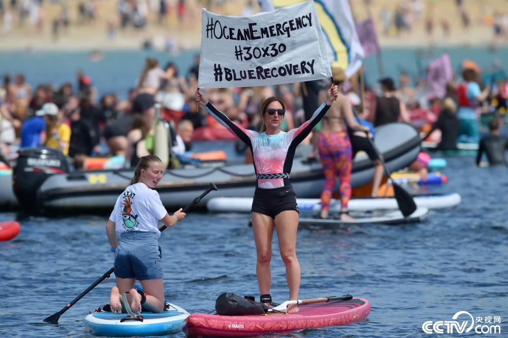 当地时间2021年6月12日,英国康沃尔,七国集团峰会举行期间,在法尔茅斯附近的Gyllyngvase海滩上,抗议者参加由环保组织发起的划水活动。
