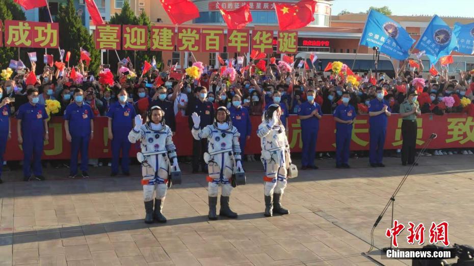 2021年6月17日清晨,神舟十二号载人飞行任务航天员乘组出征仪式,在酒泉卫星发射中心问天阁广场举行。6时32分,中国载人航天工程总指挥、空间站阶段飞行任务总指挥部总指挥长李尚福下达命令,聂海胜、刘伯明、汤洪波3名航天员领命出征,即将开启为期3个月的飞行任务,并将成为中国载人航天进入空间站阶段后的首批太空访客。图为神舟十二号载人飞行任务航天员乘组出征仪式现场。