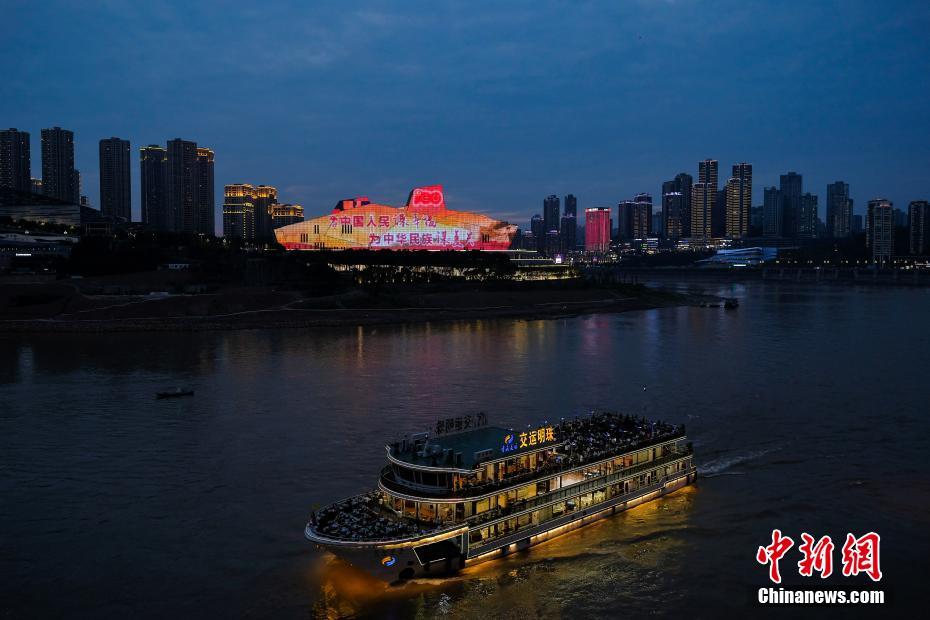 6月22日晚,重庆上演大型主题灯光秀,重庆大剧院、江北嘴等地标性建筑,展示“奋斗百年路,启航新征程”“百年征程波澜壮阔,百年初心历久弥坚”等主题口号,点亮夜空。