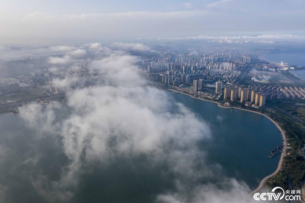 6月28日,山东青岛西海岸新区银沙滩海滨和唐岛湾上空现平流雾景观。