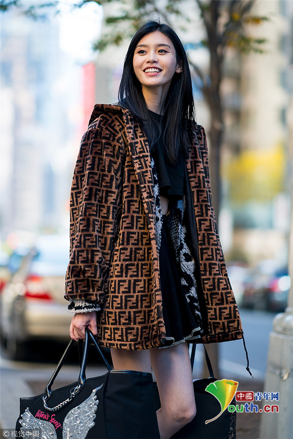 当地时间2018年11月4日,纽约,2018维多利亚的秘密内衣秀即将开始,模特们前往试装第六日。中国超模奚梦瑶身穿黑色露腰装搭配外套性感亮相,美腿纤细迷人。
