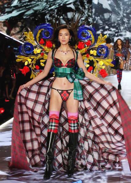 中国超模刘雯在今年维多利亚的秘密秀「 乡村英伦」环节的Look,以格纹outfit搭配三色羽翼,这也是表姐在维密秀上的第三对翅膀!