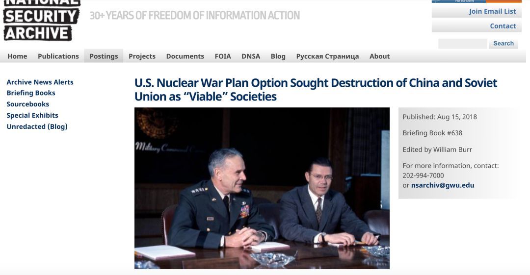 位于美国乔治·华盛顿大学的国家安全档案馆发布了美军参谋长联席会议(简称参联会)1964年制订的一项核战争计划——统一作战行动计划,其内容触目惊心,美国约翰逊政府时期(1963年11月至1969年1月)的核战计划包括对核目标、常规军事目标和城市工业目标进行打击,目的是摧毁苏联和中国的工业潜力、大量消灭两国人口,使中苏两国社会瘫痪。 早在20世纪50年代,美国军方就开始研究如何对苏联军事目标实施先发制人式打击,一些军事策划人员认为首先摧毁苏联核力量可以使战时美国的损失减轻。 然而,到1963年11月,高级防务官员得出结论,“限制损失”策略可能会失败。在白宫举行的一场高度机密的净评估小组委员会吹风会上,净评估小组委员会主任利昂·约翰逊空军上将告诉肯尼迪,“无论我们做什么,都没有办法避免核战争爆发对美国造成不可接受的损害。”尽管如此,先发制人仍然在统一作战行动计划选项之中,损害控制逻辑“深植于关于美国核武库数量和能力的决策中”。