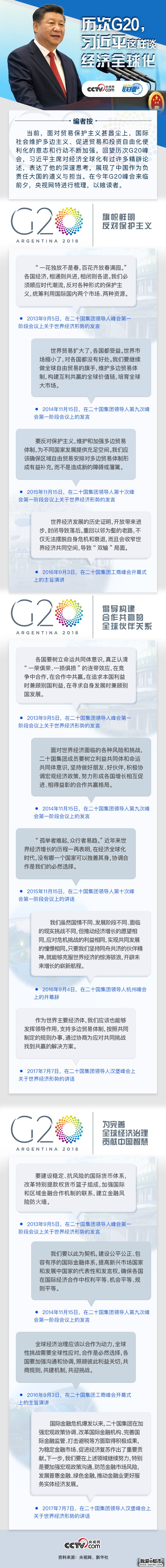 【联播+】2018年11月30日至12月1日,G20领导人第十三次峰会将在阿根廷布宜诺斯艾利斯举行。据《新闻联播》报道,习近平主席将出席,并就世界经济、贸易和投资、数字经济和气候变化等问题阐述中方立场主张。 今年适逢G20领导人峰会机制启动10周年,是习近平主席连续第六次出席或主持峰会,充分体现出中方对G20机制的高度重视,以及为完善全球经济治理贡献力量的积极意愿。 党的十八大以来,习近平主席在G20峰会上不断为世界经济贡献中国智慧、中国方案。回顾五年来习近平在G20峰会上的发言,从中能读出中国维护多边贸易体制,支持经济全球化,谋求合作共赢的决心和信心,读懂习近平胸怀世界、心系天下的中国情怀。