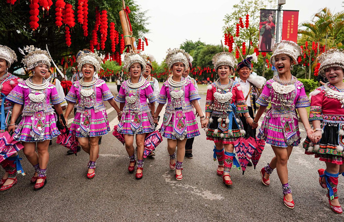 △赶歌圩是“壮族三月三”节日的重头戏。(总台国广记者李晋拍摄) 广西拥有壮、汉、瑶、苗、侗、仫佬、毛南、回、京、彝、水、仡佬等12个世居民族。各族人民共同创造了丰富多彩的文化,壮族铜鼓、桂派戏曲曲艺、京族独弦琴等民族文化活动在传承中发展,在发展中继承。