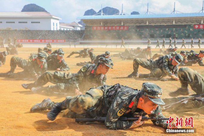 11月18日,武警广西总队训练基地新兵团依据新兵军事训练大纲要求,按照“注重基础、贴近实战、激发兴趣”的原则,组织新兵开展战术课目训练,期间穿插小游戏、小比拼,将培养血性虎气贯穿到训练中,激发新兵爱军精武热情,为下一步军事训练考核奠定坚实基础。图为武警新兵进行战术训练。 杨瑞 摄