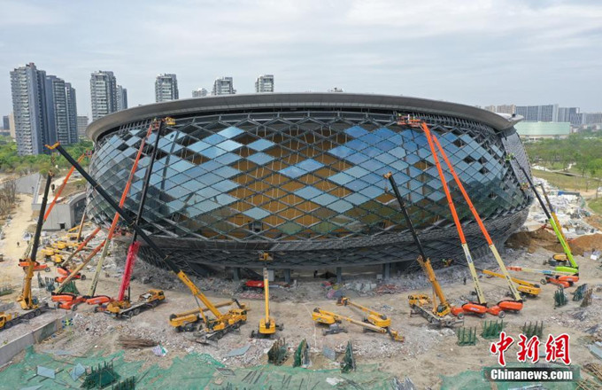 4月21日,运河亚运公园体育馆,大型机械设备进行作业。正在建设中的浙江杭州拱墅区运河亚运公园体育馆将在杭州亚运会期间承担霹雳舞项目,该体育馆建筑造型取自良渚文化的玉琮,外立面色彩和杭州亚运会吉祥物琮琮一致。亚奥理事会第39届全体代表大会2020年12月明确,电子竞技和霹雳舞正式获准列入杭州亚运会竞赛项目。中新社记者 王刚 摄 |