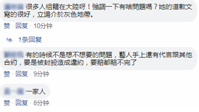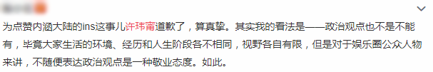此外,针对许玮甯此次因点赞而引发的事件,也有娱乐自媒体账号评论称,娱乐圈公众人物不随便表达政治观点是一种敬业态度;是否接受道歉取决于她今后的行动。