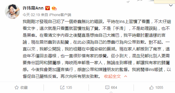 许玮甯先是表示“自己犯了一个奇蠢无比的错误”,称自己平常“习惯性点赞”,不是“手滑”,只看图没注意看文字。“在看清文字内容之后,简直是想抽自己大嘴巴,我平时最讨厌这样的言论,现在居然蠢到去点赞,在此必须为自己的愚蠢行为向公众致歉。对不起。” 随后许玮甯谈及自己祖籍,称自己是混血儿,比别人更需要身份认同和归属感,“我的祖籍在中国安徽的芜湖。现在家人都搬到了南京,这些年不仅回去寻根,也一直很珍惜有家的感觉”。 随后许玮甯称“海峡两岸都是一家人,无论走到哪里,都让我有家的归属感。”她还表示,未来会谨言慎行,会关闭Instagram帐号“以督促自己严格反省”。