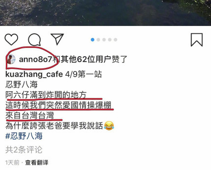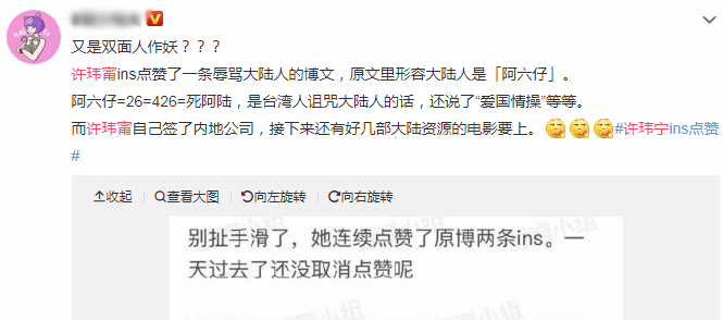 【环球网报道 记者 付国豪】有网友发现,台湾女艺人许玮甯被在社交网站“Instagram”上对一篇有侮辱大陆民众字眼并涉“台独”立场的文章点赞。随后许玮甯深夜在微博发文道歉,并解释称自己是“习惯性点赞”,还称“海峡两岸都是一家人”。对许的道歉,有网友警告称,别做两面人。 许玮甯10日晚上被大陆网友发现,其在Instagram上有一则贴文点赞。该贴文提及“阿六仔满到炸开的地方”“这时候我们突然爱国情操爆棚,来自台湾台湾”等说法↓