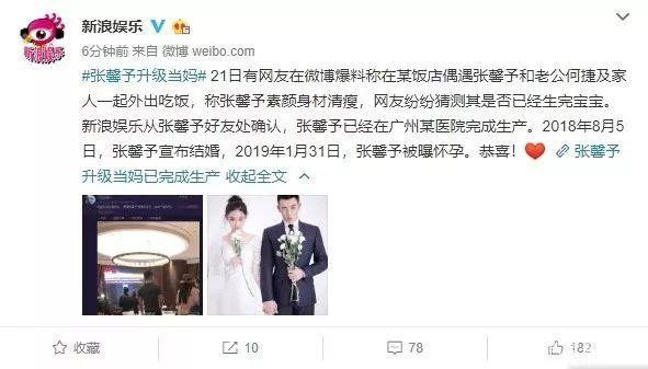 张馨予生了! ![]() 4月21日,有网友晒出了偶遇张馨予和老公何捷外出吃饭的照片。 ![]() 虽然照片只是背影,但是从身材来看,确实是张馨予夫妇。 有网友留言问:“馨予还大着肚子吗?还是已经生完宝宝了呀?” 该博主回答:“并没有看到大肚子,素颜整个人看上去很清瘦”。 有媒体就此询问张馨予好友,对方表示张馨予已经在广州某医院完成生产,恭喜张馨予升级为人母! ![]() 2018年8月5日,张馨予宣布结婚,称自己嫁给了爱情,并晒出晒出了浪漫的求婚现场,老公何捷一位武警指战员,两人结识于综艺节目《奇兵神犬》。 ![]() ![]() ![]() 2019年1月31日,张馨予被曝怀孕,如今按照生子时间推算,当时应该是奉子成婚! ![]() 再次恭喜张馨予晋升人母!也希望宝宝能健康快乐成长! |