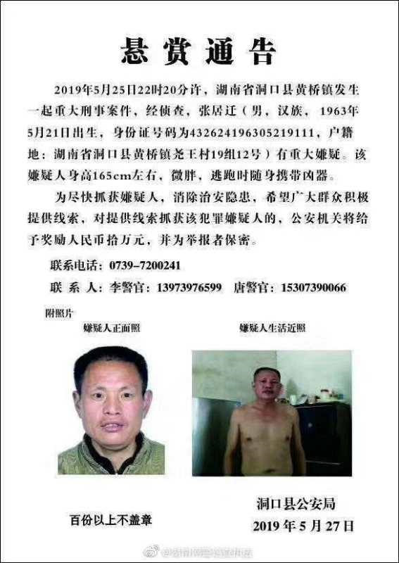 ![]() 5月27日晚间,洞口县公安局增加悬赏金额至10万元。来源:洞口公安 新京报讯(记者 刘名洋)5月21日、25日,湖南省洞口县接连发生两起重大刑事案件,5人被当地村民张居迁杀害。5月27日晚间,有网传消息称,凶手又逃窜至湖南嘉禾县作案后被警方控制。当日新京报从洞口县公安局了解到,据判断凶手仍在洞口境内,网传凶手逃窜至嘉禾县作案为不时消息,目前已安排千余名警力搜捕凶手。 5月23日、26日,湖南省洞口县公安局相继发布悬赏通告称,湖南省洞口县黄桥镇分别于5月21日、25日发生两起重大刑事案件。经过侦查,两起重大刑事案件中黄桥镇尧王村村民张居迁((男,汉族,1963年5月21日出生,身份证号码为432624196305219111)有重大作案嫌疑。5月27日晚间,洞口县公安局将其悬赏奖励金额从最初的2万元调整为10万元,并希望广大群众积极提供相关线索。 新京报记者从湖南省公安厅网络安全保卫与技术侦察总队获悉,上述两起重大案件分别为5月21日下午17时50分许,凶手张居迁在洞口县车塘村委门口杀害村民张某红。5月25日晚22时20分许,凶手张居迁再次做案,在东林水库附近残忍杀害刘姓两位老人和两位小孩。 5月27日下午,有网传消息称,凶手张居迁已逃窜至湖南嘉禾县作案,有人被杀害,后被警方控制。当日晚间新京报记者从洞口县公安局了解到,网传张居迁逃窜至嘉禾县石塘村作案为不实消息,据警方判断,目前张居迁仍在洞口境内,已安排千余名警力搜捕凶手。 目前,警方对提供抓捕犯罪嫌疑人的悬金已从最初的2万元增加至10万元。洞口警方提醒,张逃跑时携带有凶器,虽然警方已安排警力在县城内巡视,为了安全起见,当地居民夜间仍需关好门窗,不要给陌生人开门。 |