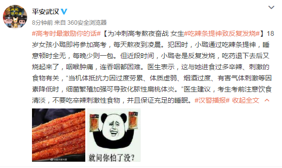 武汉市公安局微博消息:18岁女孩小璐即将参加高考,每天熬夜到凌晨。犯困时,小璐通过吃辣条提神,睡意顿时全无,每晚少则一包。但近段时间,小璐老是反复发烧,吃药退下去后又烧起来了,咽喉肿痛,连吞咽都困难。医生表示,这与她进食过多辛辣、刺激的食物有关,“当机体抵抗力因过度劳累、体质虚弱、烟酒过度、有害气体刺激等因素降低时,细菌繁殖加强可导致化脓性扁桃体炎。”医生建议,考生考前注意饮食清淡,不要吃辛辣刺激性食物,并且保证充足的睡眠。