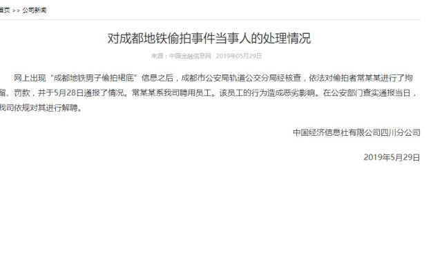 新京报快讯 据中国经济信息社网站5月29日消息,网上出现“成都地铁男子偷拍裙底”信息之后,成都市公安局轨道公交分局经核查,依法对偷拍者常某某进行了拘留、罚款,并于5月28日通报了情况。常某某系中国经济信息社有限公司四川分公司聘用员工。该员工的行为造成恶劣影响。在公安部门查实通报当日,中国经济信息社有限公司四川分公司依规对其进行解聘。 ![]() ![]() 编辑 彭启航 |