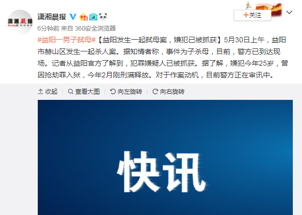 ![]() 5月30日上午,益阳市赫山区发生一起杀人案。据知情者称,事件为子杀母,目前,警方已到达现场。记者从益阳官方了解到,犯罪嫌疑人已被抓获。据了解,嫌犯今年25岁,曾因抢劫罪入狱,今年2月刚刑满释放。对于作案动机,目前警方正在审讯中。 |