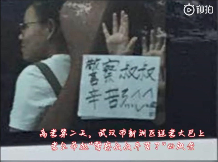 6月8日, 高考的第二天。 下午两点左右, 在武汉市新洲区实验中学考点附近, 一辆载满高考考生的大巴车队 驶过交警执勤岗位时, 一个写着“警察叔叔辛苦了...^_^...”的纸条, 被车上的同学牢牢“拍”在了车窗上。