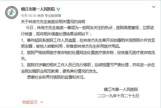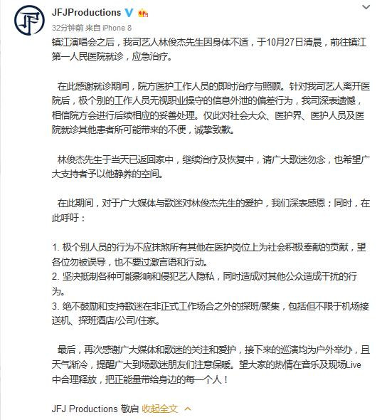 新京报讯(记者 杨畅)10月27日,歌手林俊杰在江苏省镇江市第一人民医院就医信息被泄露。有视频称,医院医护人员在林俊杰走后轮流躺床上,其使用过的吊水针头和注水包疑被医护人员出售给粉丝。10月28日零时,镇江市第一人民医院发文回应林俊杰的吊水针头被出售一事,称起因系医院工作人员追星,在林俊杰离开后拍摄相关视频、照片发朋友圈,被他人转载利用称售卖林俊杰所用医疗用品,但经核查无医疗废弃物流失,涉事的相关工作人员已停职,后续视情节严肃处理。 ![]() 28日上午,林俊杰经纪公司JFJProductions 发布长文回应,表示对极个别工作人员无视职业操守泄露信息的行为深表遗憾,同时呼吁大家不要因此对其他在医护岗位上的工作人员产生过激言语与行动,呼吁抵制侵犯艺人隐私、扰乱公共秩序的行为,并表示绝不鼓励和支持歌迷在非正式工作场合之外的探班、聚集。 ![]() |