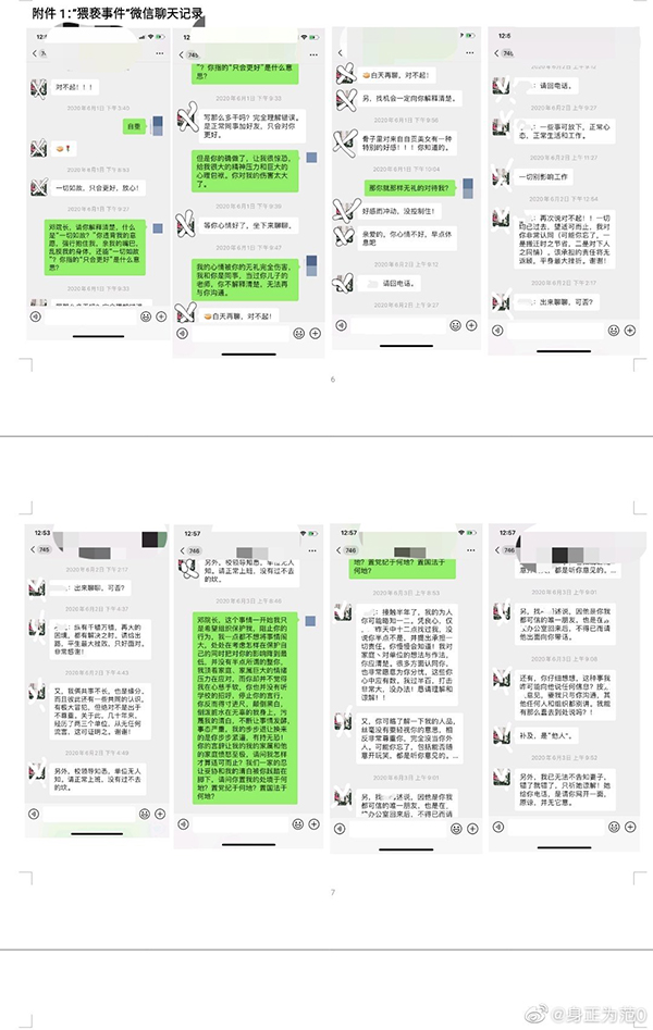 邓前程道歉聊天记录 来源:@身正为范0 前述聊天记录截图称,李丽称邓前程违背其意愿,强行抱住并亲吻她。事发后,邓前程多次表达歉意,希望恳请对方原谅。病情诊断书显示,6月22日、7月2日两次诊断均为“精神障碍”,建议住院治疗。 截至发稿前,澎湃新闻暂未能联系到邓前程进行置评。 四川文化教育高等研究院官网显示,该院成立于2017年,是学校单独设立的科研机构、深化科研体制改革的特区和试验田。2018年,李丽担任该院党支部组织委员一职。 四川师范大学官网2019年4月16日发布的消息称,邓前程担任历史文化与旅游学院副院长。 澎湃新闻注意到,2020年5月7日,四川文化教育高等研究院召开教职工大会,邓前程围绕明确高研院发展方向,增强教职工的幸福感和成就感等有关情况进行了说明。 澎湃新闻记者 吕新文 实习生 史航 |