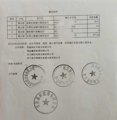 2011年与2012年的贷款申请相关文件中,程小琼的签名笔迹 这两份贷款合同的担保方式,都是“程小琼提供定期存单质押担保”。杨先生认为,这是整个贷款事件的第二个涉嫌造假之处:“完全有可能是假的,我妈必须要提供至少1000万的存单,才可能拿去做抵押物。我家里别说1000万了,2011、2012年那个时候,我们家2万块钱都拿不出来。哪里可能有存单去抵押?再换个思维想我们家要都有那么多钱了,何苦还要去贷款?” 第三处涉嫌造假,是实际用款人用来还款的,办在程小琼名下的那张浦发银行的还款卡。程小琼的儿子杨先生说:“包括银行的流水里面,我妈的那张浦发银行的卡也肯定是他们盗用我母亲的身份信息去浦发办的,我母亲个人就从来没有使用过这个卡,公司也盖了章,证明卡的用途我母亲完全不知情。” 当事人丈夫曾是贷款流入的公司股东 丈夫去世后当事人继承股份 国家企业信用信息公示系统显示,程小琼于2011年3月实缴出资40万,成为汶川顺发电熔冶炼有限公司的股东,而该公司正是这两笔贷款的实际使用人。杨先生坦承,其母亲程小琼在该公司的股东身份,是因其父亲在2008年地震中遇难之后,继承而来的。但这与程小琼是否被冒名贷款之间,并无直接关联。 “不管是不是股东,没有任何人有权利拿去冒名贷款,所以其实跟我妈是不是这个公司股东或者占股多与少,都没有任何关系。我父亲在08汶川地震遇难之后,我母亲就继承了我爸在汶川工作的那家公司的一点点股份,我妈妈在公司是完全没有任何职务的,也没有一分钱的工资,10多年也没分过一分钱的红,连我妈妈的社会养老保险都是我们自己缴纳的,公司的经营情况我们根本就不知道,实际就是名义上的股东,名存实亡。” 杨先生认为,更关键的是,实际使用资金的公司有关人员,已经明确承认了这笔贷款是怎么办出来的:“我母亲继承我去世的父亲的一点点股份之后,我们就去这个公司找。有一个财务总监已经承认了,这个就是由公司控制人让他们去浦发银行办的贷款。”