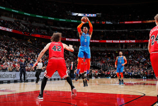 公牛队拉文25分4篮板7助攻9失误,马尔卡宁24分7篮板,帕克16分7篮板4助攻。雷霆队韦斯布鲁克24分17篮板13助攻10失误,乔治19分5篮板6助攻,亚当斯21分10篮板,施罗德19分5篮板3助攻。