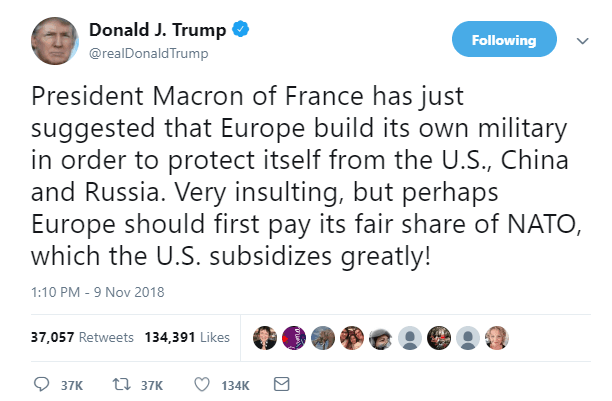 特朗普推特:“法国总统马克龙刚刚建议欧洲建立其自己的军队来防御美国,中国和俄罗斯。这非常侮辱人,或许欧洲首先应该在北约上付出其公平的份额,而现在主要是美国在承担这些费用。”