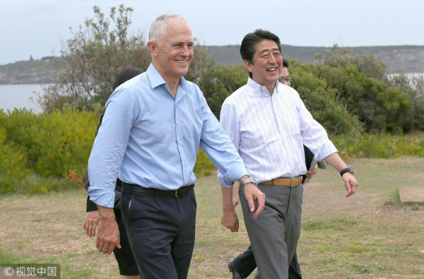 2017年1月,安倍与澳大利亚前总理特恩布尔走在悉尼港(视觉中国) 据日本共同社报道,为配合本周的澳大利亚出访活动,日本首相安倍晋三将同澳大利亚总理莫里森共同拜访二战战殁者纪念碑。该纪念碑位于澳大利亚北部的达尔文地区,第二次世界大战时期曾受日军空袭。 据日本外交机构12日消息,此次拜访二战纪念碑活动,对于日本首相来说极其罕见。安倍此举表明,希望日澳两国达成“和解之力”,跨越过去,成为新的战略合作伙伴。