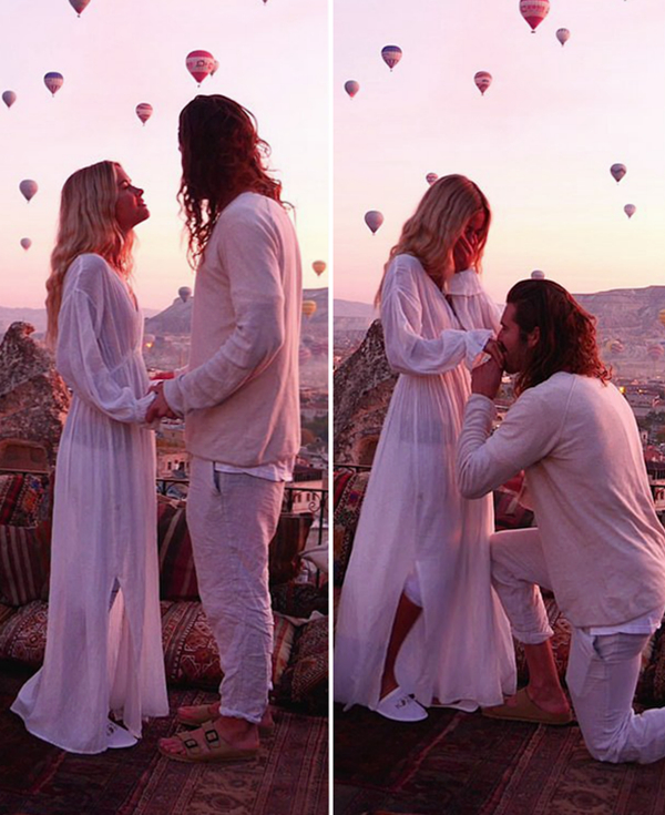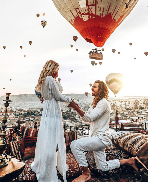 视频里的主角为摄影师杰克•斯诺(Jake Snow)和女友玛丽•费(Marie Fe),他们一起周游世界并定期上传一些珍贵的照片。因此,当26岁的杰克让28岁的玛丽在土耳其卡帕多西亚摆姿势拍照时,她没有发现任何异常。没想到,杰克接下来的动作竟是向她求婚。 在这段视频中,这对情侣手牵着手,看着对方的眼睛,直到杰克伸手去掏戒指。这段视频被传到网上后,至今已经被观看了近100万次。
