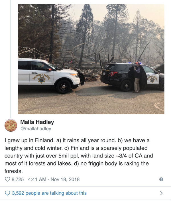 据英国《卫报》,特朗普当地时间周六前往加州灾区视察,在谈到预防山火时,特朗普称,“我之前与芬兰总统在一起,他说‘芬兰是个森林之国’,但芬兰花很多时间耙地清理落叶,所以他们的森林没有大问题”。 其言下之意即是,加州发生如此严重的火灾,原因是没有像芬兰般耙地防灾。 然而,芬兰总统Niinisto周日即对当地媒体称,他从未与特朗普讨论“耙地”的事儿。Niinisto称,“我对特朗普提过芬兰被森林覆盖,同时我们有一个很棒的防火体系”,但并未和他讨论过耙地清理落叶。 社交媒体上,芬兰网友们也被特朗普“逗乐了”。 有网友称,“让美国再次耙地”。 也有网友称,“在芬兰,即使是冬天我们也不忘清理森林,以防万一”。 还有网友一本正经地分析芬兰防火做得好的原因,“a)芬兰全年多雨;b)我们有一个又长又冷的冬季;c)芬兰是个人口稀少的国家,面积约为加州的3/4,大部分是森林和湖泊;d)没有人在耙森林。”