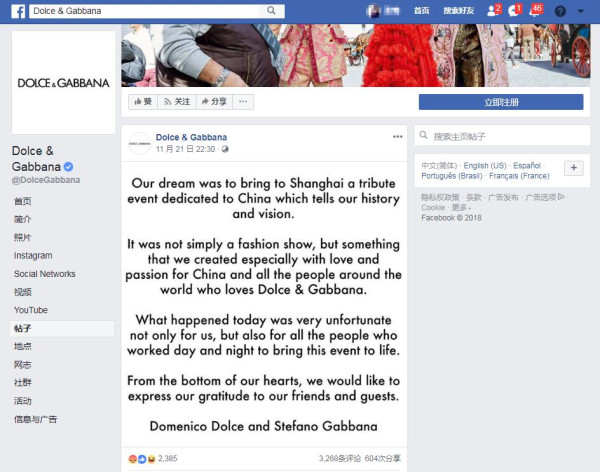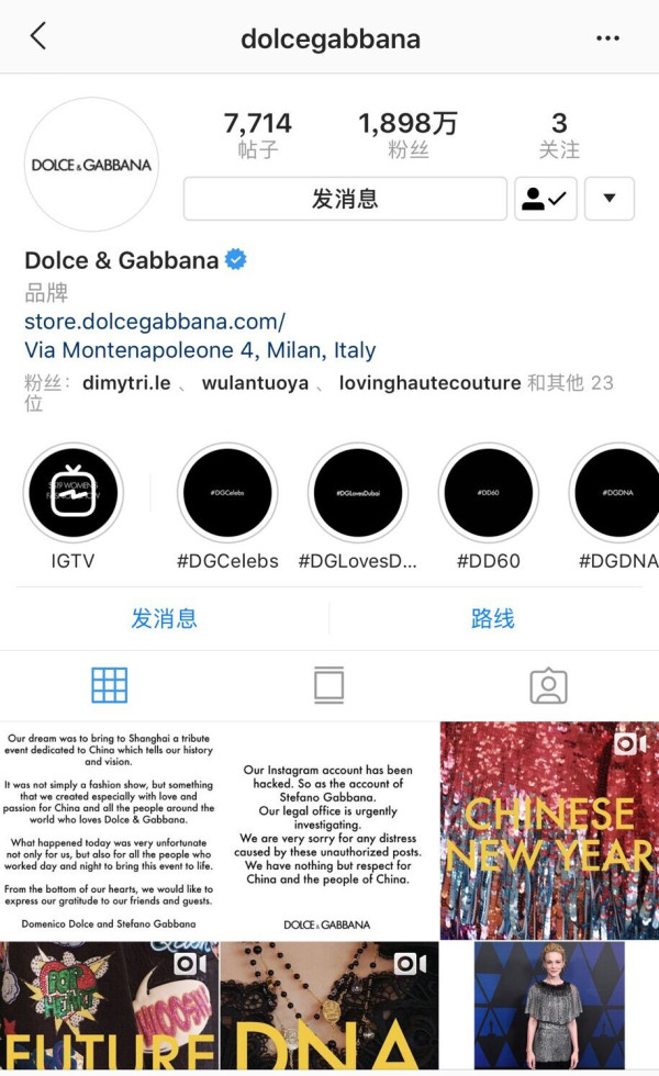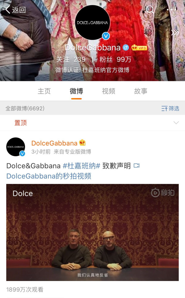 杜嘉班纳官方微博截图 原标题:杜嘉班纳道歉声明只在中国发,海外官方社交账号未见动静 【环球网报道记者张骜左甜】23日,杜嘉班纳两位创始人公开道歉,二人用中文说了对不起,希望得到中国人的原谅,但是环环发现,他们的声明只发布在了中国微博上,道歉视频并未在脸谱、推特和Ins等其他海外官方社交账号公开。 截止到目前为止,杜嘉班纳的三大海外账号截图如下,最新动态依然是其21日对上海大秀取消的回应。 杜嘉班纳Ins截图↓