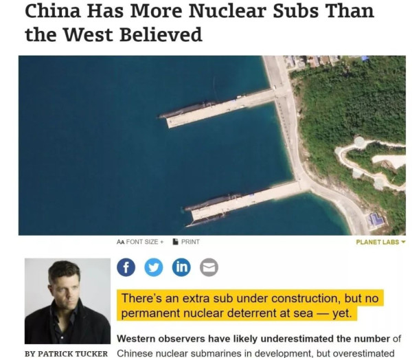 ▲“防务一号”网站报道截图 “防务一号”(Defense One)网站11月20日发布了题为《中国拥有的核潜艇多于西方此前判断》的文章,其引述美国米德伯里国际研究所分析人员的观点称:该研究所从商业卫星公司“行星实验室”获得了自2017年7月至2018年10月期间连续244天的卫星图片。根据这些图片判断,在大约同一时间内,中国有5艘被称为晋级或094型的战略核潜艇出现在两个地点——3艘在一处海军基地,2艘在一处造船厂的码头。