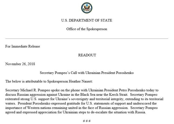 【环球网综合报道 记者 赵衍龙】俄罗斯与乌克兰关系紧张之际,美国站出来说话了。 美国国务院26日在官网上发布声明称,美国务卿蓬佩奥星期一与乌克兰总统波罗申科通了电话,讨论俄罗斯在刻赤海峡附近黑海水域对乌克兰的“侵略”行为。