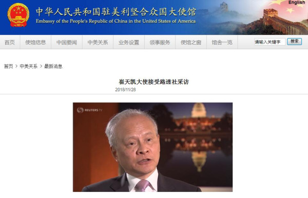 【环球网综合报道】中国驻美国大使馆28日消息,崔天凯大使27日赴路透社华盛顿分社与该社20多名记者座谈并接受采访,就中美元首会晤、中美关系、中美经贸、涉疆等问题等回答了对方提问。主要内容如下: 一、记者问及二十国集团(G20)领导人峰会特别是特朗普总统与习近平主席会晤的重要意义及对会晤有何期待?习主席与特朗普总统之间的个人关系对双边关系有何作用? 崔大使表示,G20本身对全球经济非常重要,它是10年前发生全球金融危机时国际社会协力应对的产物,已成为在全球经济治理方面卓有成效的多边机制。G20峰会达成共识将有助于提振人们对世界经济和大国关系前景的信心。中方希望峰会取得成功,将尽一切努力帮助东道主阿根廷实现这一目标,希望G20所有成员一道努力,彰显支持、理解和承诺。 崔大使说,习近平主席与特朗普总统在峰会期间的会晤,是两人今年唯一一次面对面交流的机会。此次会晤的主要目的是为中美关系作出全面战略引领和政治指导。我们都非常期待元首会晤明确引领中美关系未来走向,为双方工作团队解决包括经贸问题在内的具体问题提供战略指导。双方都有责任确保会晤取得成功,而不是相反。中方正同美国白宫、国务院和其他部门密切合作,为会晤做好充分准备。 崔大使说,元首外交对中美这组复杂、全面且不断发展的双边关系至关重要。习主席和特朗普总统举行了3次会晤,分别是海湖庄园会晤、汉堡会晤和北京会晤,两位元首还多次通话、通信,建立了良好的工作关系和个人友谊。最近一次通话是11月1日,两人进行了长时间友好交谈。我相信这种态势能够延续下去。 二、记者问及中方对解决中美经贸问题持何种立场?中方对美方提出的要求清单中哪些问题绝不考虑?中方对美方关税措施可能采取什么样的反制措施?美方制裁晋华等中国企业是否会为中美贸易冲突中加入新元素? 崔大使说,中方无意同包括美国在内的任何国家打“贸易战”,希望通过谈判解决问题。中方尽力关注美政府和商界的合理关切,努力照顾并寻求以互惠互利方式解决这些关切,同时中方也提出了自身的关切,只是到目前为止,我还没有看到美方对中方关切做出足够回应。对于一方拉单子、开条件,另一方只能予以满足的做法,中方无法接受。双方应平衡对待彼此关切,寻求一个双方均能接受的、互惠互利的解决方案。中方不是经贸问题升温的始作俑者,其降温不是中方能一力承担的,需要双方共同努力,特别是美方体现善意和诚意。 崔大使表示,包括中美在内的所有国家都有自己的安全关切,都有不容侵犯的根本性、关键性的国家利益。任何政府都有责任维护自已国家的核心和重要利益,中国政府也是如此。中方会评估有关举措对自身的影响,然后再决定什么是维护自身正当利益的最好做法。中方的行动和反应一贯遵循负责任原则,不仅对自身利益负责,也对两国乃至整个国际社会的共同利益负责。 崔大使说,我认为美方针对中国公司的制裁等举措扰乱了市场功能,削弱了基于规则的多边贸易体系,很显然是单边主义、保护主义措施。中方对此表示反对。人们不能在训导别人应让市场发挥自身作用、政府不应过多干预的同时,自己却在做这样的事。 三、记者问及美方有人企图推动中美经济脱钩,中方如何看待?如何应对中美关系中可能出现的风险? 崔大使说,推动中美经济脱钩既不可能,也无益处。两国经济高度依存,对世界经济也负有共同责任。作为世界上最大的两个经济体,中美怎么可能真正摆脱彼此呢?那些鼓噪中美经济脱钩的人,应真正认识到后果和影响。对中方进行胁迫、恐吓或试图将两国关系引向错误方向是极其危险且不负责任的,不会对任何一方有利,不仅损害中美两国利益,也将损害广大国际社会的利益。希望那些身居要职的人谨言慎行。