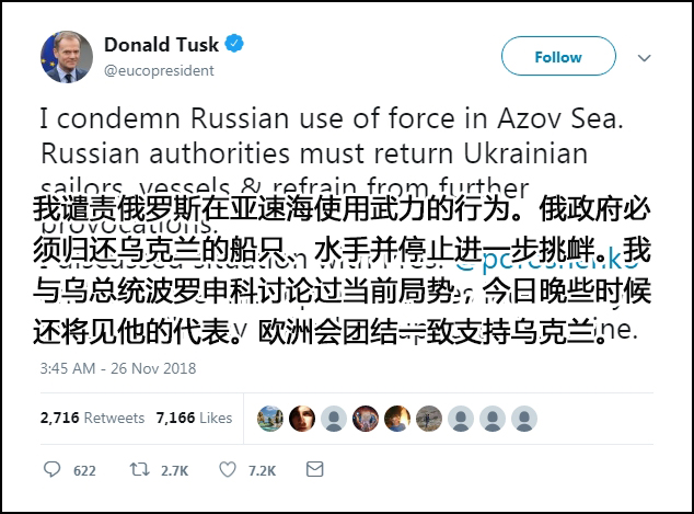 波兰籍欧洲理事会主席图斯克26日发推谴责俄罗斯,称欧盟会“团结一致”支持乌克兰图源:推特@eucopresident 26日,俄罗斯联邦安全局(FSB)发布消息称,乌克兰的3艘军舰在黑海水域侵犯俄罗斯边境,已被俄军扣留,在此过程中为了逼迫其停止,俄军使用了武器,乌克兰方面有三人受伤。 欧盟声明称:“欧盟对近日亚速海和刻赤海峡紧张局势危险升级表示极度关注……我们对俄罗斯使用武力感到不安,这在该地区日益加剧的军事化背景下是不可接受的。” 声明指出,欧盟“呼吁各方表现出最大的克制并立即降低局势的升级,坚决敦促俄罗斯立即释放被俘船只及其船员”。 俄罗斯总统普京称该事件是乌克兰“基于国内选举”而制造的挑衅,强调俄罗斯边防部队履行了保卫国界的职能。普京还与德国总理默克尔通话,希望柏林对乌克兰政府施加影响,“说服其不要采取进一步的莽撞行动”。