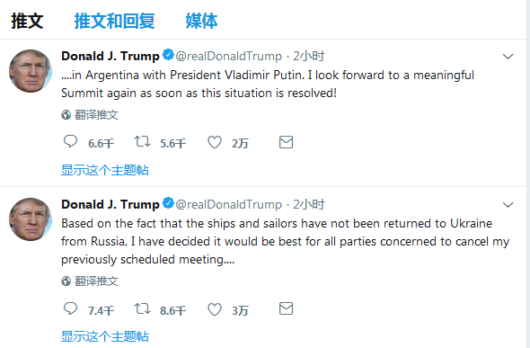 特朗普推特截图。 【环球网报道 记者 赵建东】美国总统特朗普29日发推称,因俄乌危机,决定取消与俄罗斯总统普京在G20峰会期间的双边会晤。此前,克林姆林宫称,普京将于12月1日与特朗普举行会晤。 特朗普在推文中表示,“鉴于船只和船员尚未从俄罗斯返回乌克兰,我决定,有关各方最好取消我先前安排在阿根廷与普京总统举行的会晤。我期待上述情况得以解决后,尽快再次举行有意义的首脑会晤。” 另据路透社援引白宫发言人的话报道称,特朗普在与国务卿蓬佩奥、安全顾问博尔顿以及白宫幕僚长凯利等人交谈后,决定取消与俄总统普京的会晤。白宫发言人桑德斯表示,特朗普是在前往阿根廷的空军一号飞机上做出的这一决定。