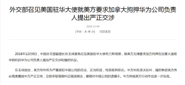 2018年12月9日,中国外交部副部长乐玉成紧急召见美国驻华大使布兰斯塔德,就美方无理要求加方拘押在加拿大温哥华转机的华为公司负责人提出严正交涉和强烈抗议。
