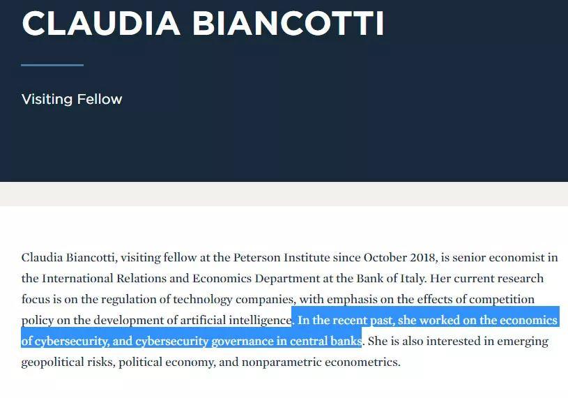 而文章的作者克劳蒂娅⋅比安科蒂(Claudia Biancotti)则有着西方情报口的背景,曾经在意大利从事“网络安全”方面的工作。