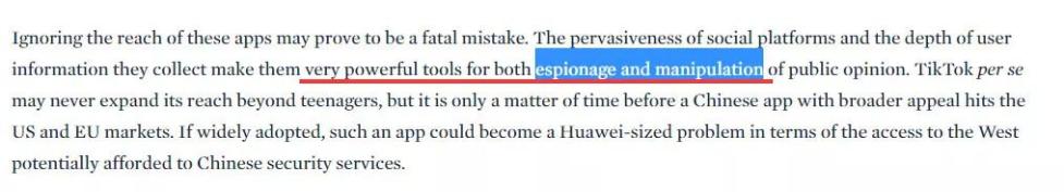 但最值得注意的是,她在文章的最后不仅强烈呼吁欧美国家必须重视“抖音”这种【中国IT企业】带来的新“安全隐患”,更“毫不遮掩”地表示只要是【来自中国的、与中国存在关联的】手机APP,都可能成为中国政府实施“间谍”和“民意渗透”的工具。 “不能让抖音成为下一个华为那样的问题”,她恐吓说。