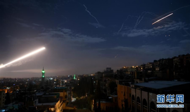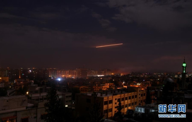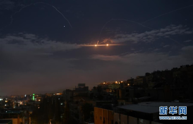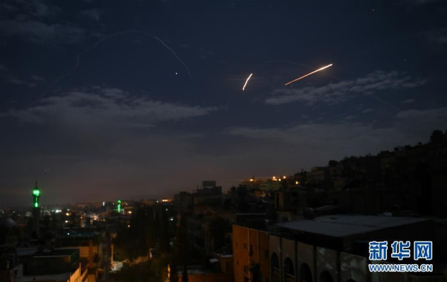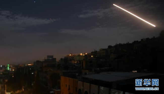 1月21日凌晨,在叙利亚大马士革,叙防空系统对来袭导弹实施拦截。叙利亚军方21日说,以色列当天凌晨对叙利亚发动导弹袭击,叙防空系统摧毁了大部分来袭导弹。