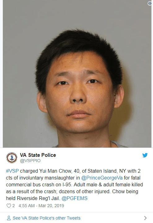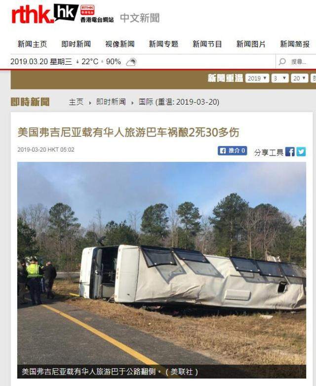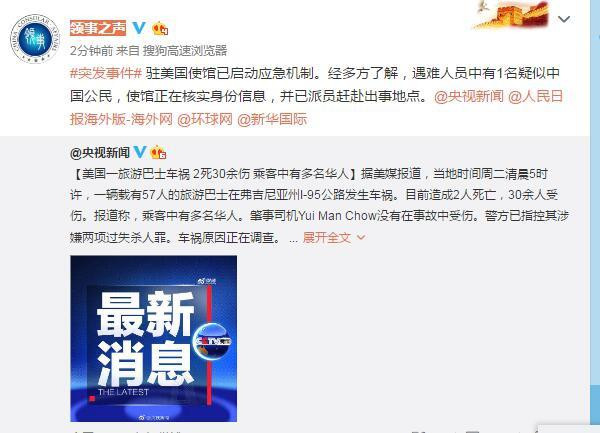 据领事之声消息,驻美国使馆已启动应急机制。经多方了解,遇难人员中有1名疑似中国公民,使馆正在核实身份信息,并已派员赶赴出事地点。 ![]() 此前报道 美载57人大巴翻车致2死30余伤 港媒:伤者中有多名华人 【环球网报道 记者 朱梦颖】综合多家外媒消息,当地时间19日凌晨5时许,美国弗吉尼亚州一辆载有57名乘客的大巴车突然翻车,造成2人死亡,30多人受伤。香港电台网称,伤者中有多名华人。 ![]() 大巴侧翻现场图 图源:《华盛顿邮报》 ![]() 香港电台网报道截图 美国全国广播公司(NBC)称,当地时间19日凌晨5时22分左右,一架载有57人的旅游大巴,原定由奥兰多驶回纽约。当驶至弗吉尼亚州里士满以南乔治王子县95号州际公路的出口坡道转弯时,大巴突然失控发生侧翻。 当地警方称,正在调查大巴车侧翻原因。NBC援引乔治王子县警方的话称,当天早晨的大雾已导致该地区发生多起车祸。 ![]() 事发现场当天早晨大雾 图源:NBC新闻网 弗州警方表示,1人当场死亡,另有1人送院后伤重不治,还有30多人需要留院接受治疗,其中包括多名儿童。 据香港电台网报道,伤者中有不少华人,医院需要安排普通话翻译。报道还称,涉事旅游大巴公司过去两年纪录良好,自2013年开业以来,没有发生过严重交通意外。大巴公司19日表示,对此次事故暂无评论。 另据《华盛顿邮报》消息,现年40岁的大巴车司机Yui Man Chow在事故中没有受伤。弗州警方称,他被指控两项过失杀人罪。 ![]() 弗州警方推特截图,图为失事大巴车司机 |