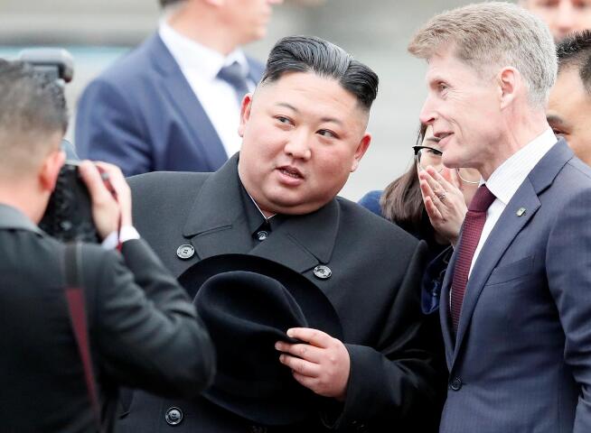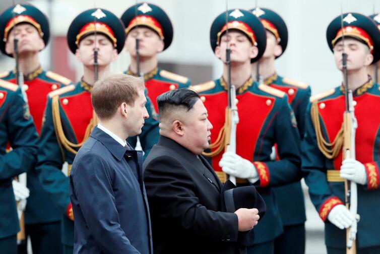 报道说,仪仗队军乐团在车站广场迎接金正恩。 金正恩抵达符拉迪沃斯托克/图自路透社 |